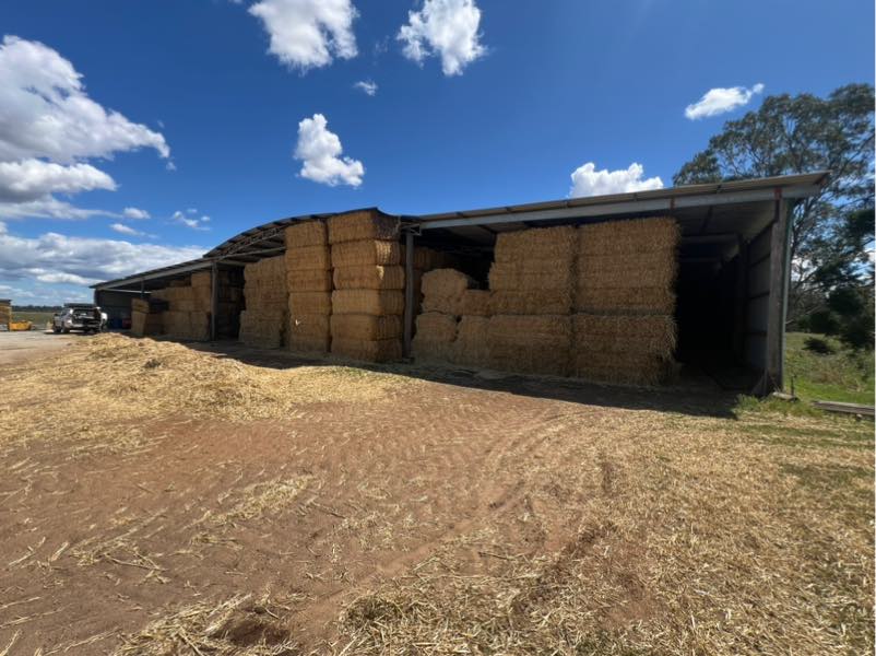 Notes: Utility line of Oaten hay, hold plenty of leaf with mild to soft feel. Has lost some colour and aroma due to rain mid curing. Well shedded, will work well for weaners or TMR hay.