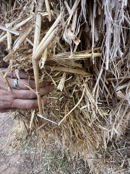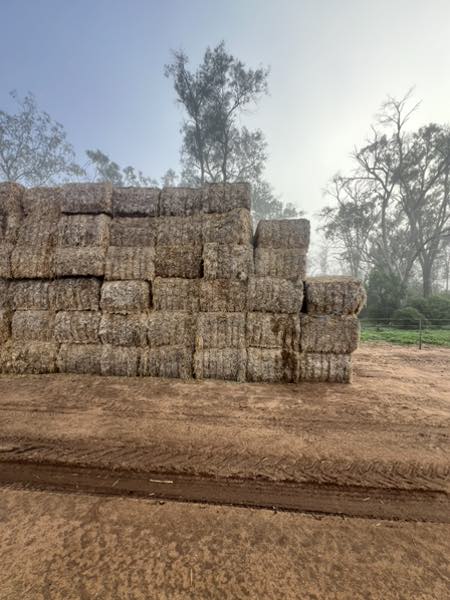 Notes: Large line of barley header tailings received rain after bailing sitting as individual bales in paddocks then stack three high. It’s been stacked like this since bailing top bales of significant rainfall moisture average is very very high to good fiber sauce for hungry cattle.