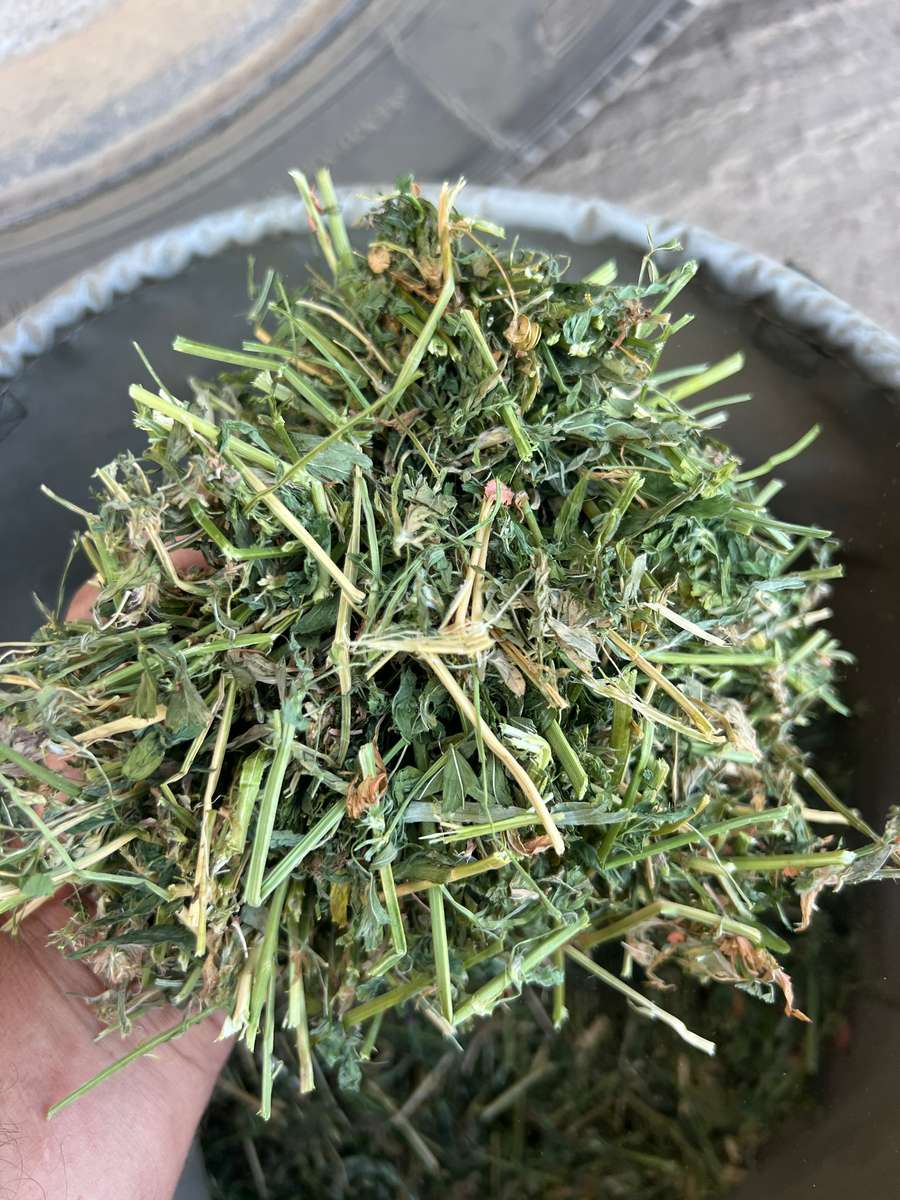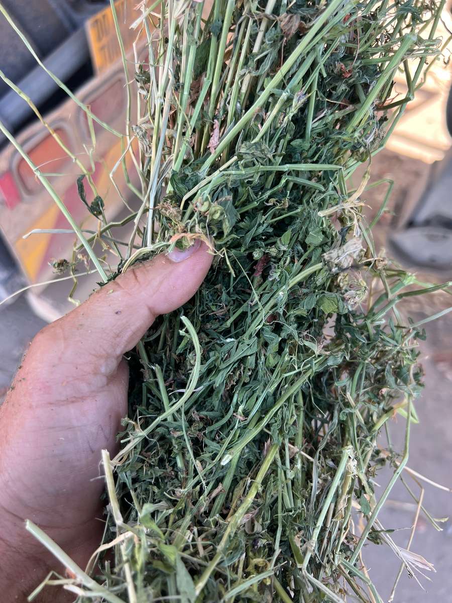 Beautiful part of autumn cut lucerne excellent leaf retention and colour, tops of windrows slightly bleached from dewy nights still makes prime grade..