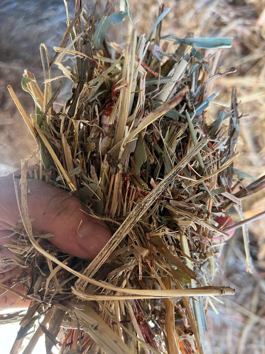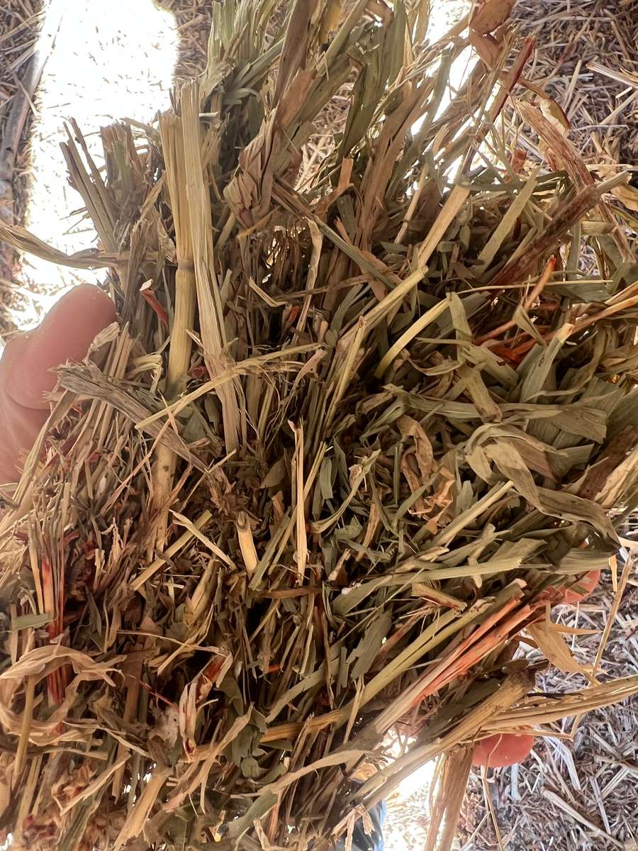 Small line of shedded forage sorghum holding good colour and hay aroma only graded utility because of maturity with a few seed heads visible. Good weaner hay.