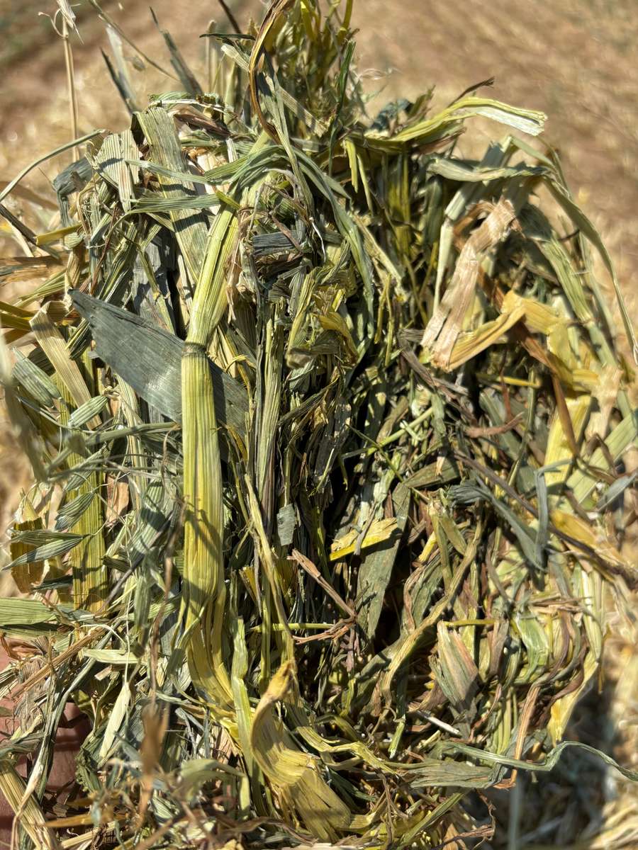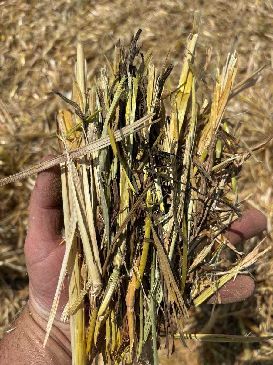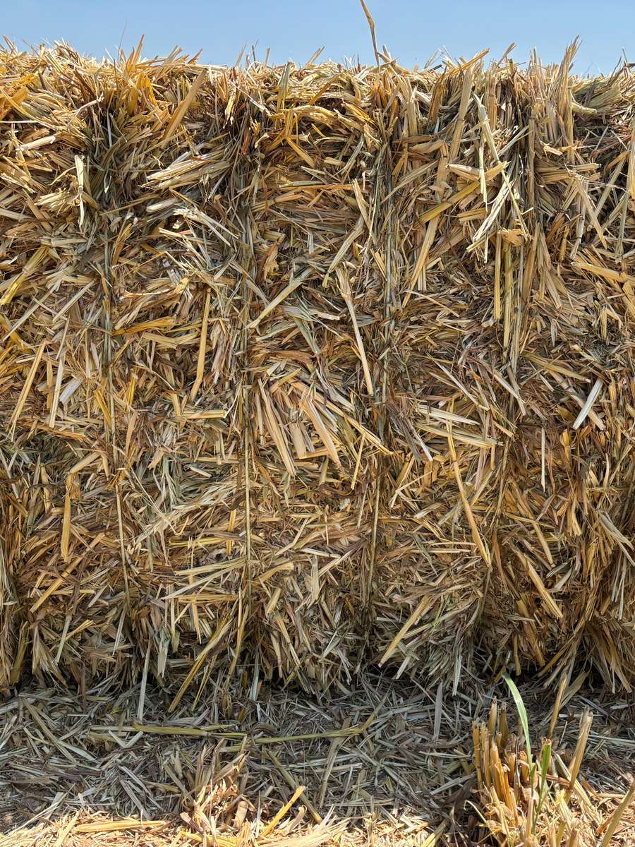 Good line of 2025 Oaten Hay but does show some signs of weather damage. It had 25mls in the windrow.