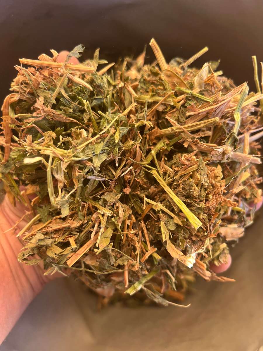 Small line of shedded vetch hay, holds good hay aroma. Holds 50% colour some colour lost to rainfall during curing. In all good hay cattle will find palatable