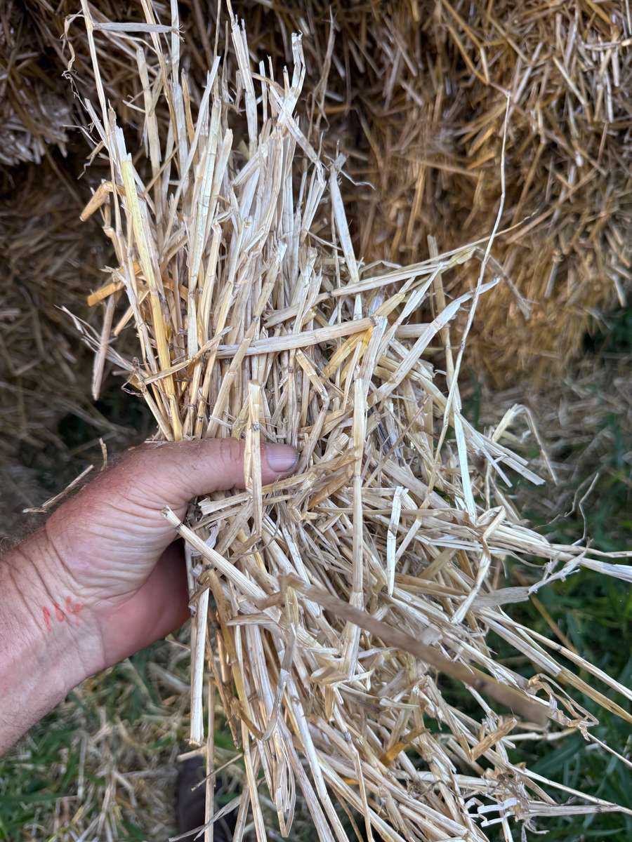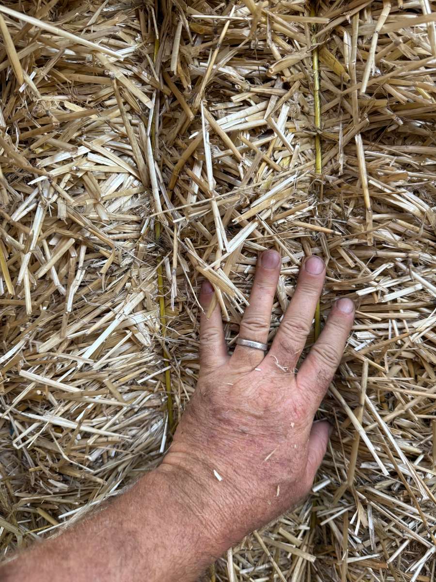 This is a nice line of barley straw that got rained on in the windrow. It was raked a few times and then baled. Contractor struggled to get all the moisture out of it, so it presents with some clumps with high moisture that is not really high but over 18%. When they raked it, they picked up a little bit of Corn Stubble and a tiny little bit of dirt in some sections, but the straw is quite clean and presents very well.