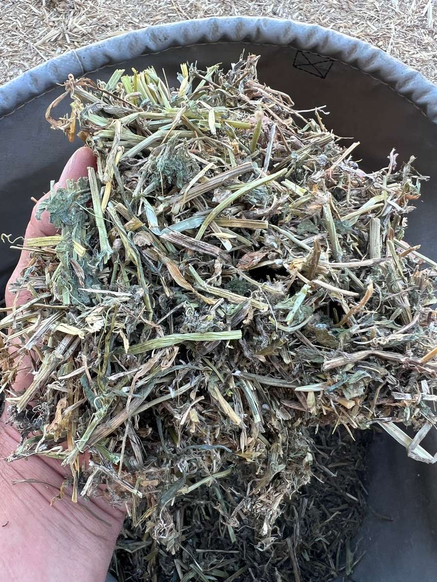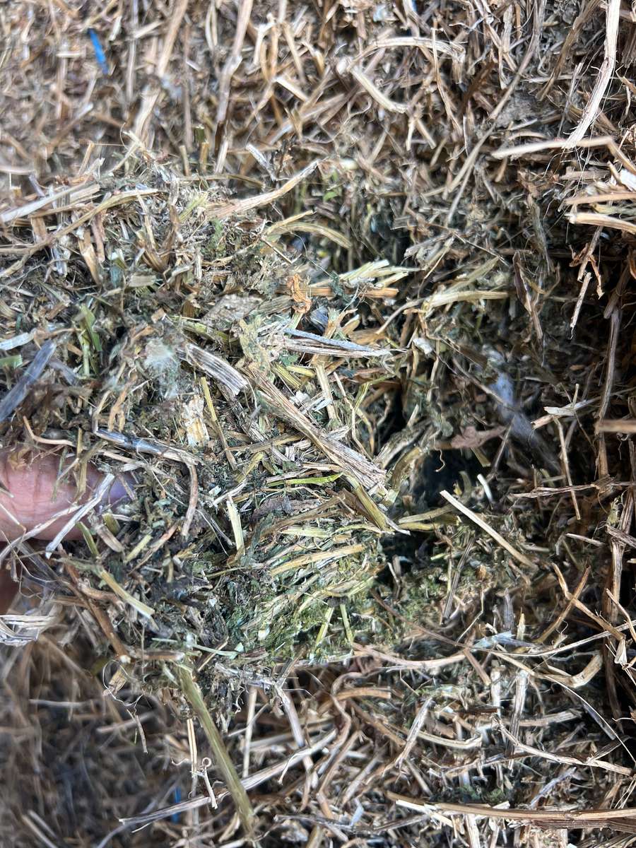 Large line of utility to low grade vetch hay, shows significant downgrade from cool to wet curing period lacking in aroma and colour. See how it tests.