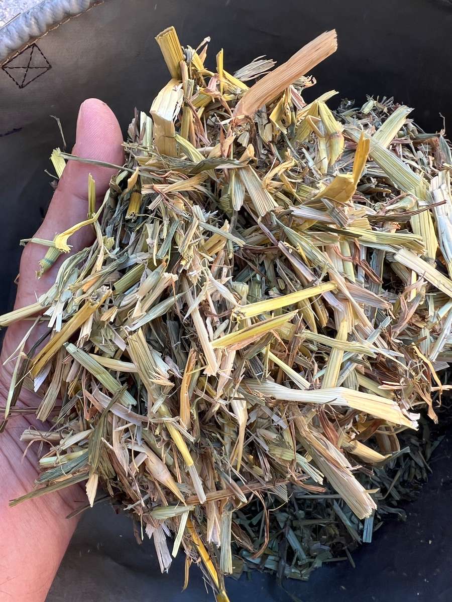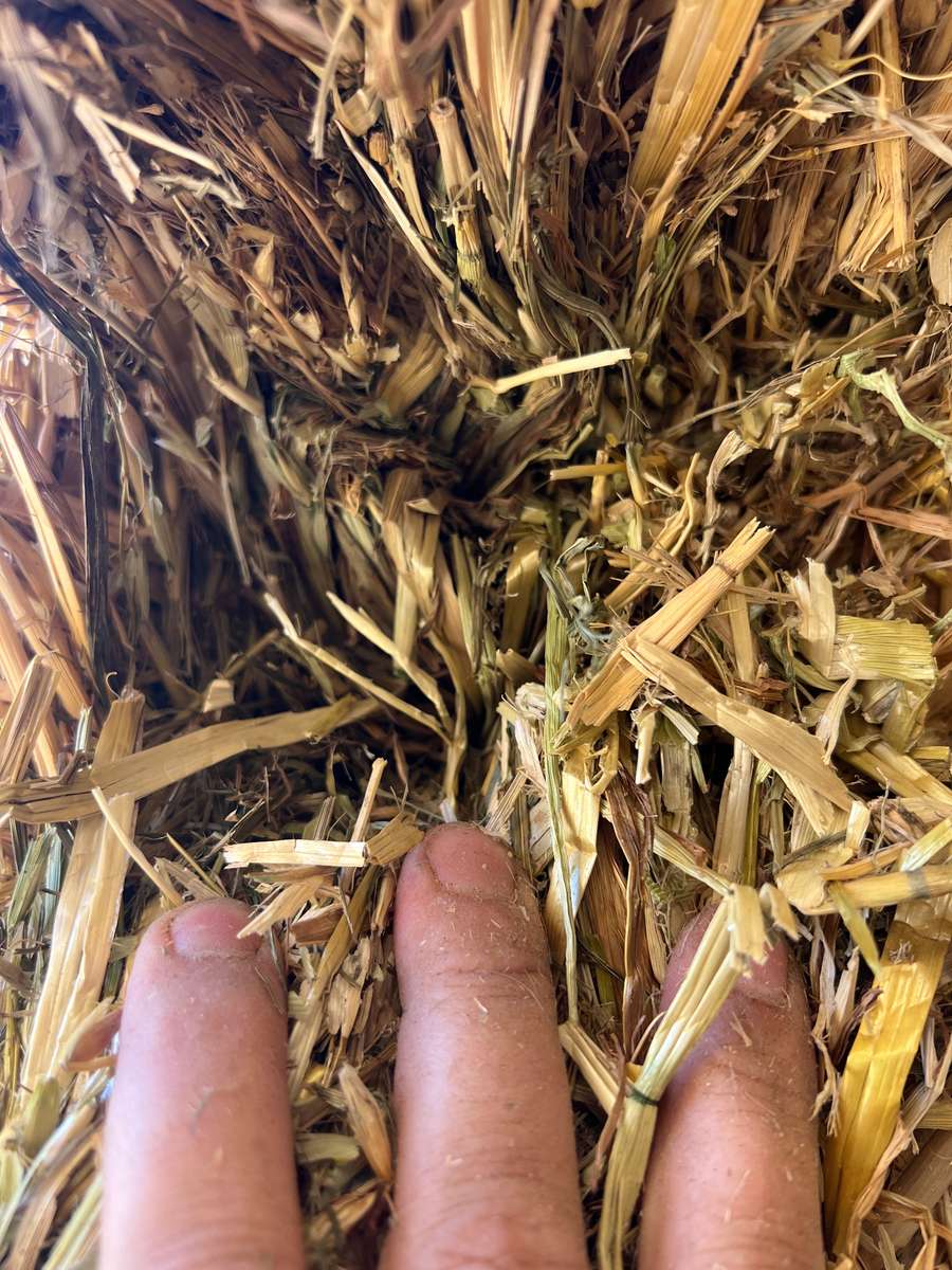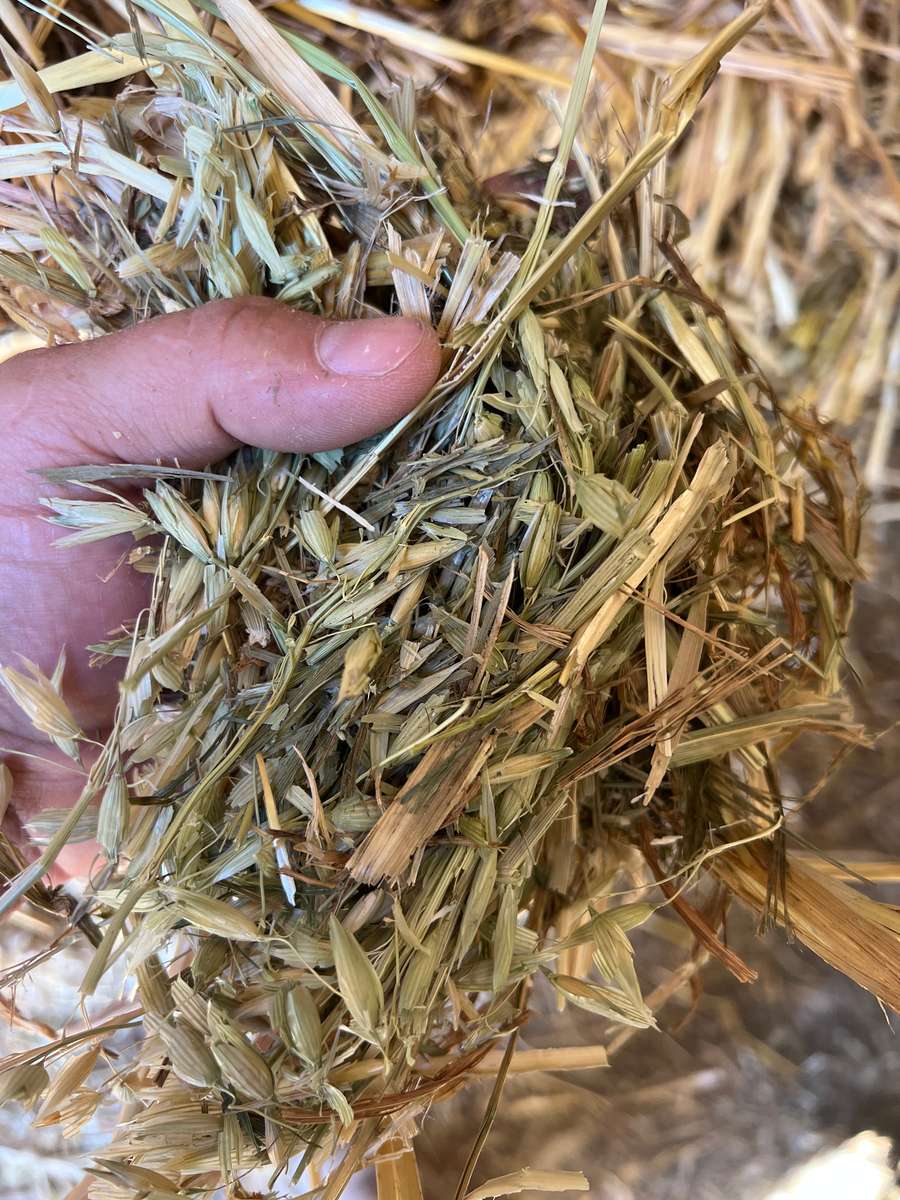 Utility line of shedded Oaten hay, shows signs of slow cool curing period with some staining. All round filler hay.