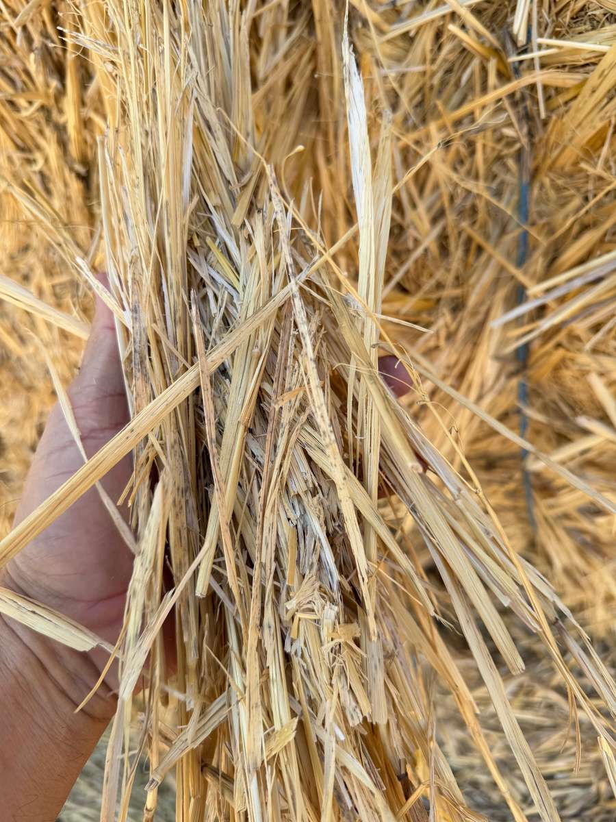 Windrowed straw up to 450mm long. No rain during baling. Possible rain on standing stubble. Solid bales in 3 stacks.