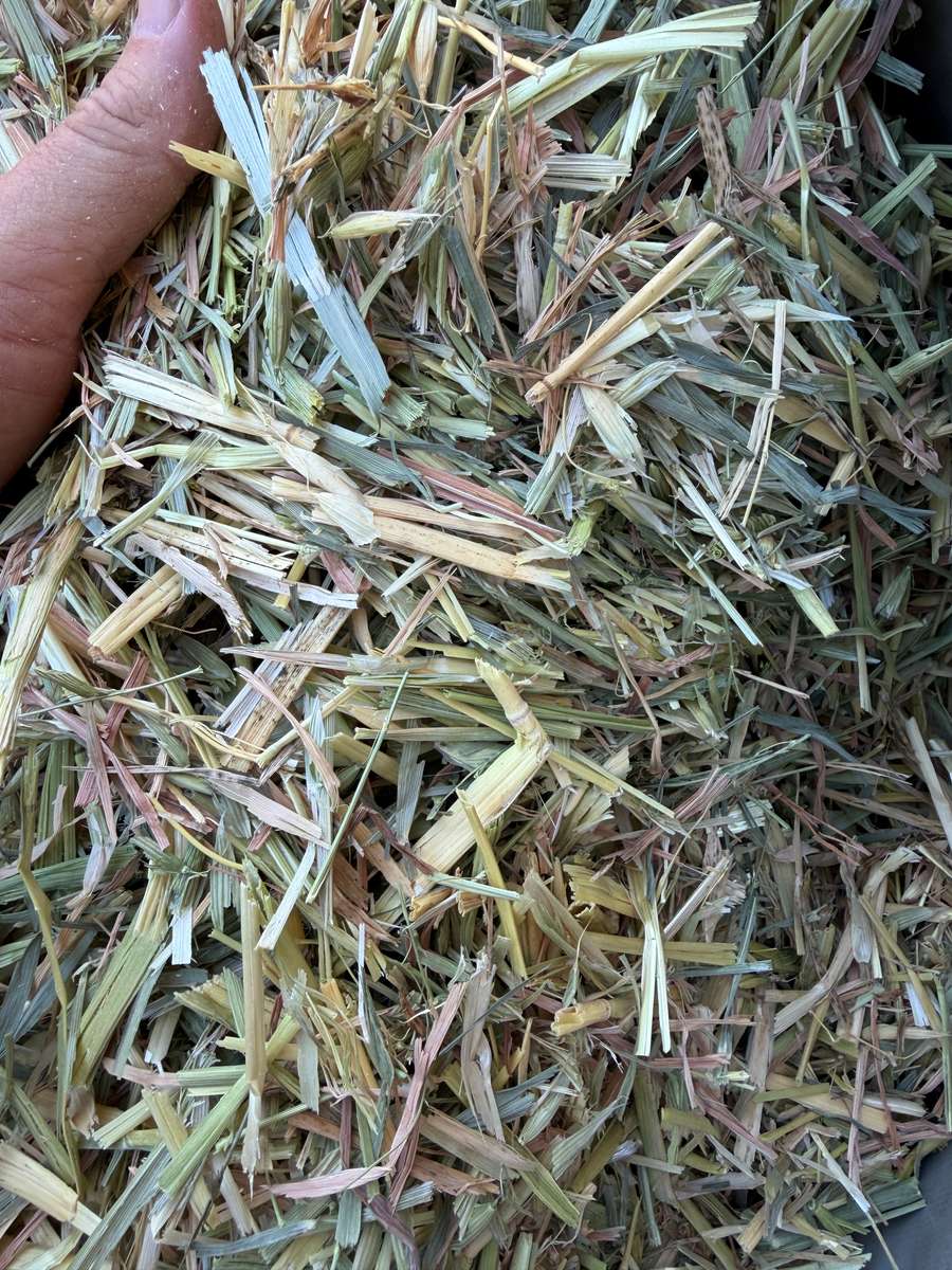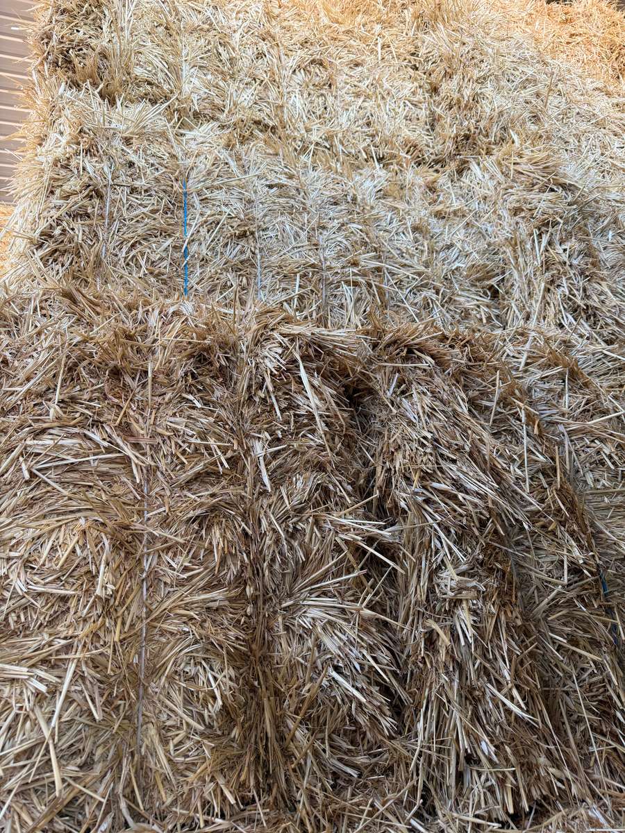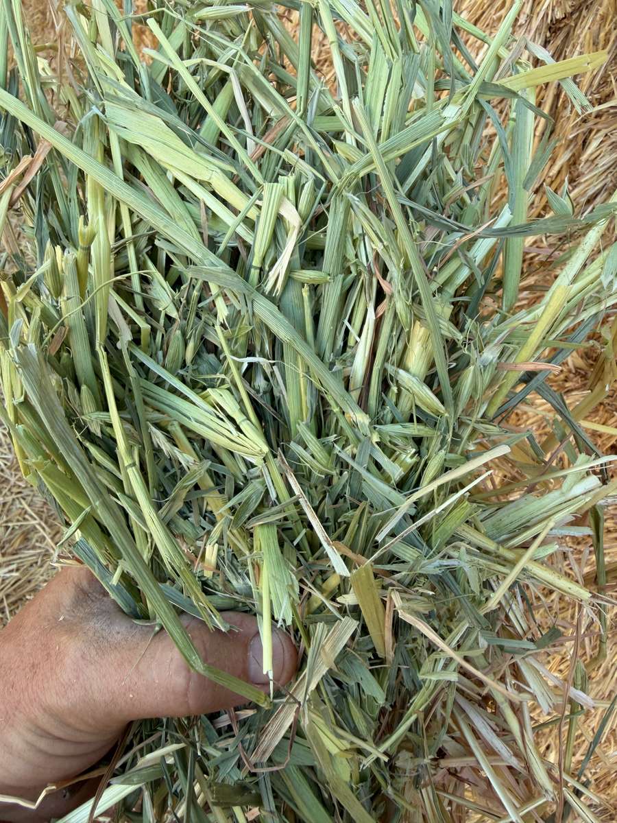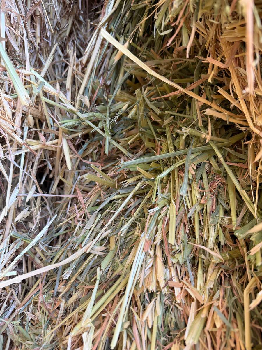 Very nice line of Oaten hay. Great colour, smell and texture. Well stacked 9 high on plastic over gravel.