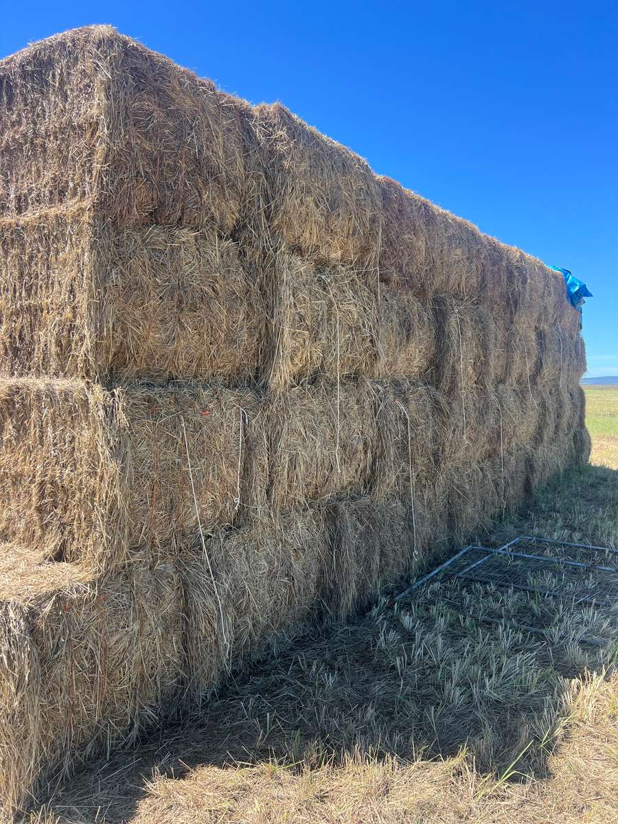 Mature pasture hay consists of Rhodes & blue grass and some summer legumes.
