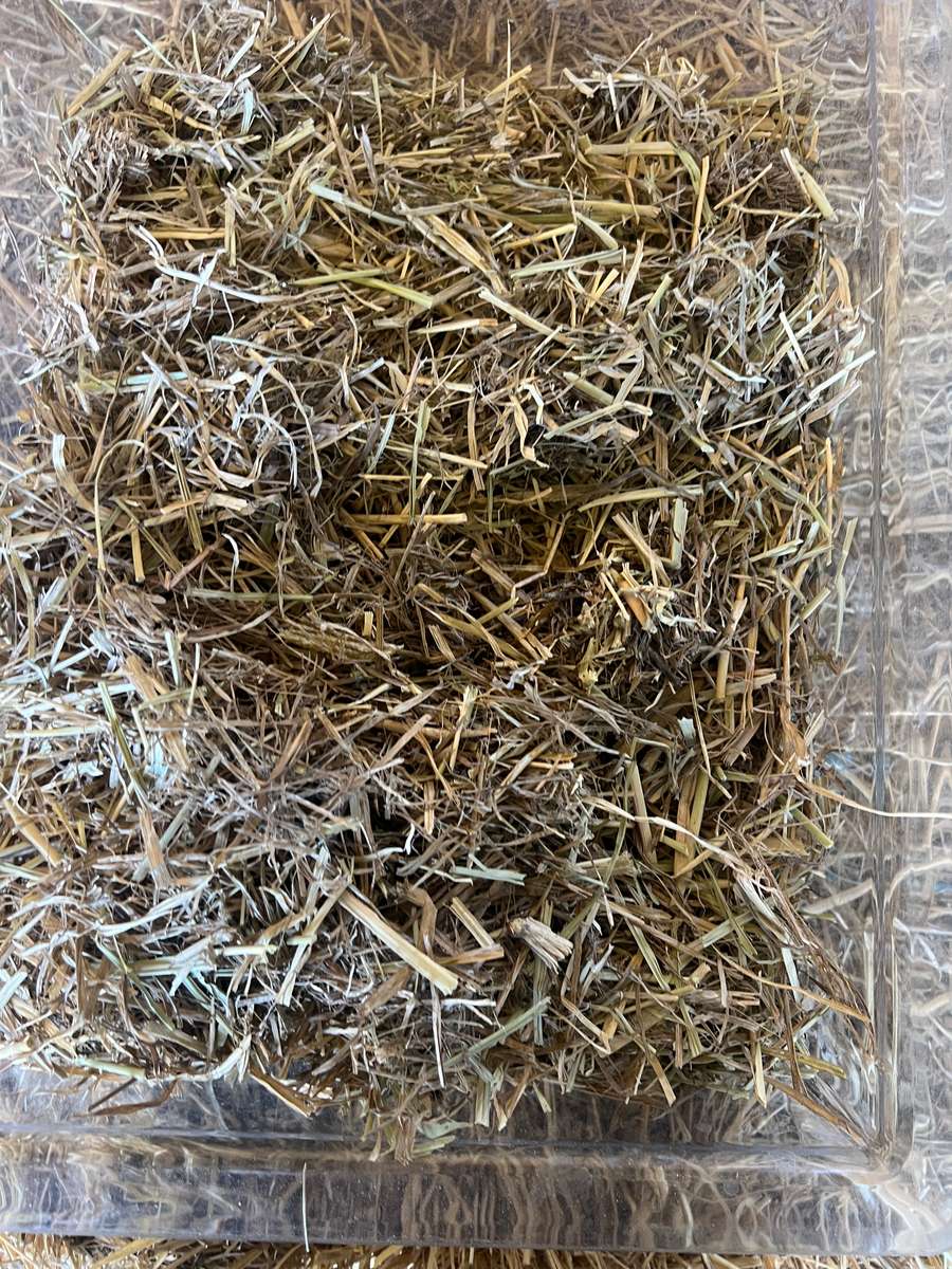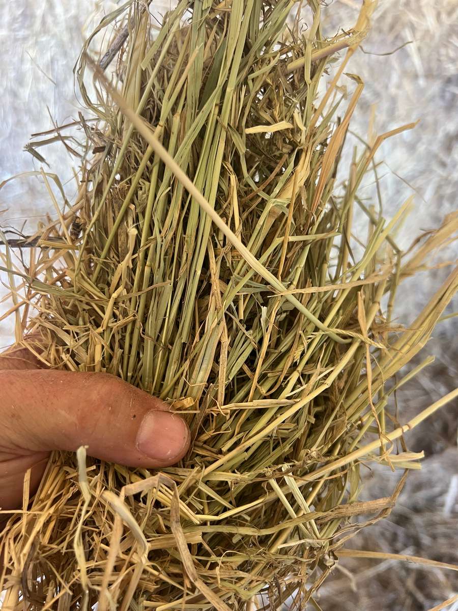 Mature Rhodes grass, blue grass and pasture legume hay, cut late to clean up paddock. All round filler for unfussy cattle.