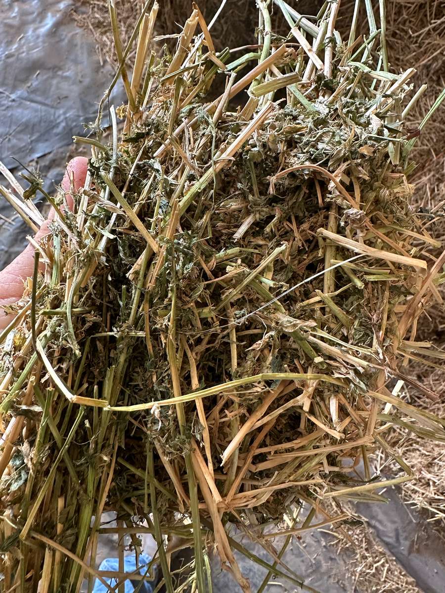 10 mm rain in windrow. Some bleaching and lost a little aroma and a bit of leaf. Overall still not too bad.