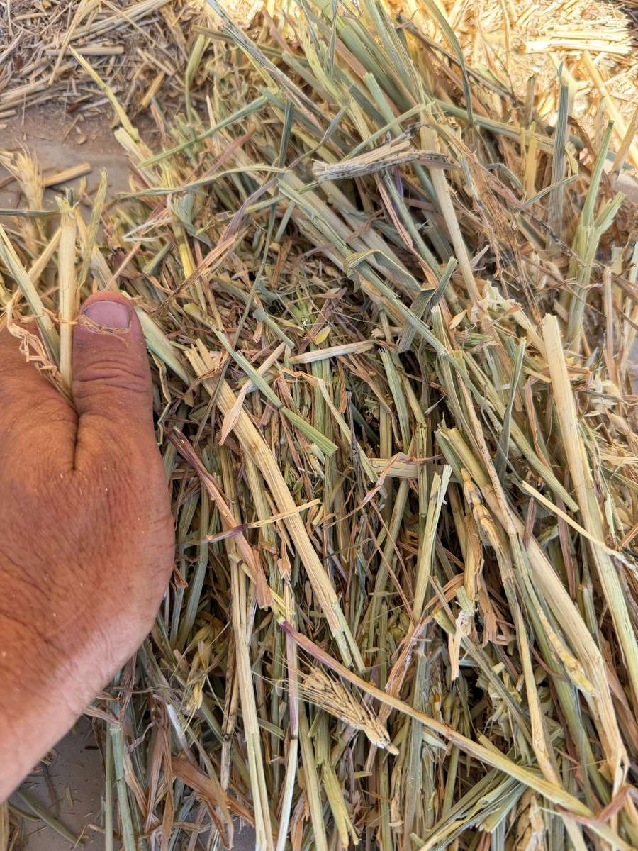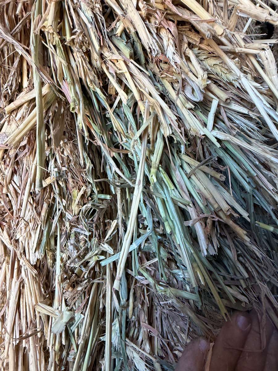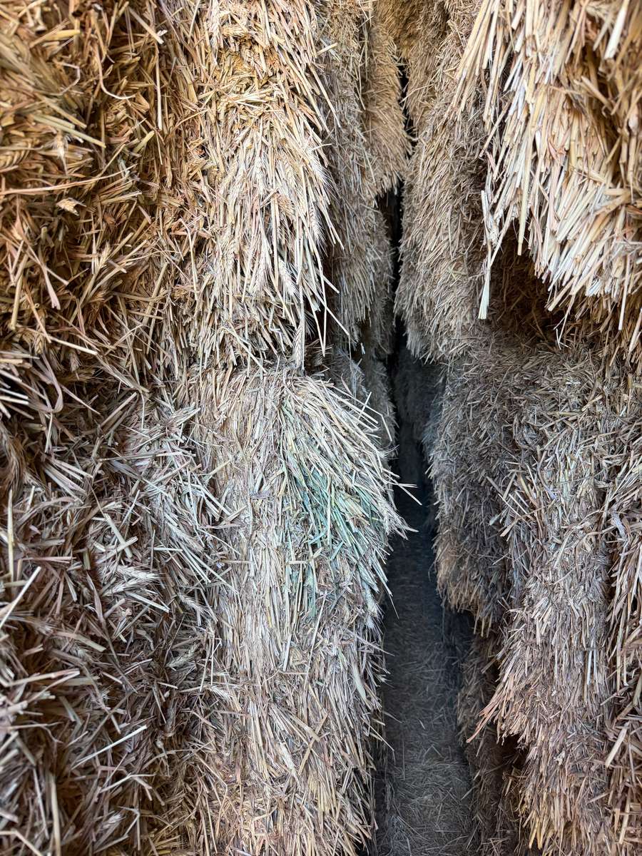 Nice solid bales of Wheaten hay. Lack colour and aroma. Strong presence of brown flag leaf in samples. Bales stacked up to 8 high